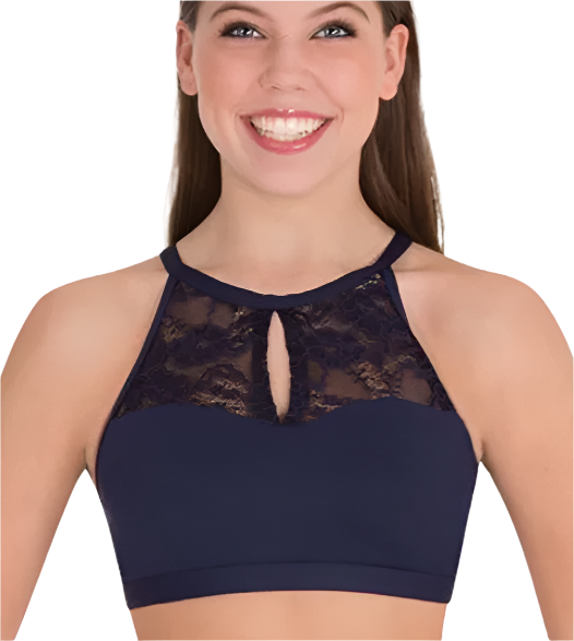 This Bodywrappers top has a sweetheart line with a lace yoke trimmed in solid lycra. It has an attractive small keyhole in the front and the lace extends to the back. There's a single elastic bra band and a snap at back of the collar.