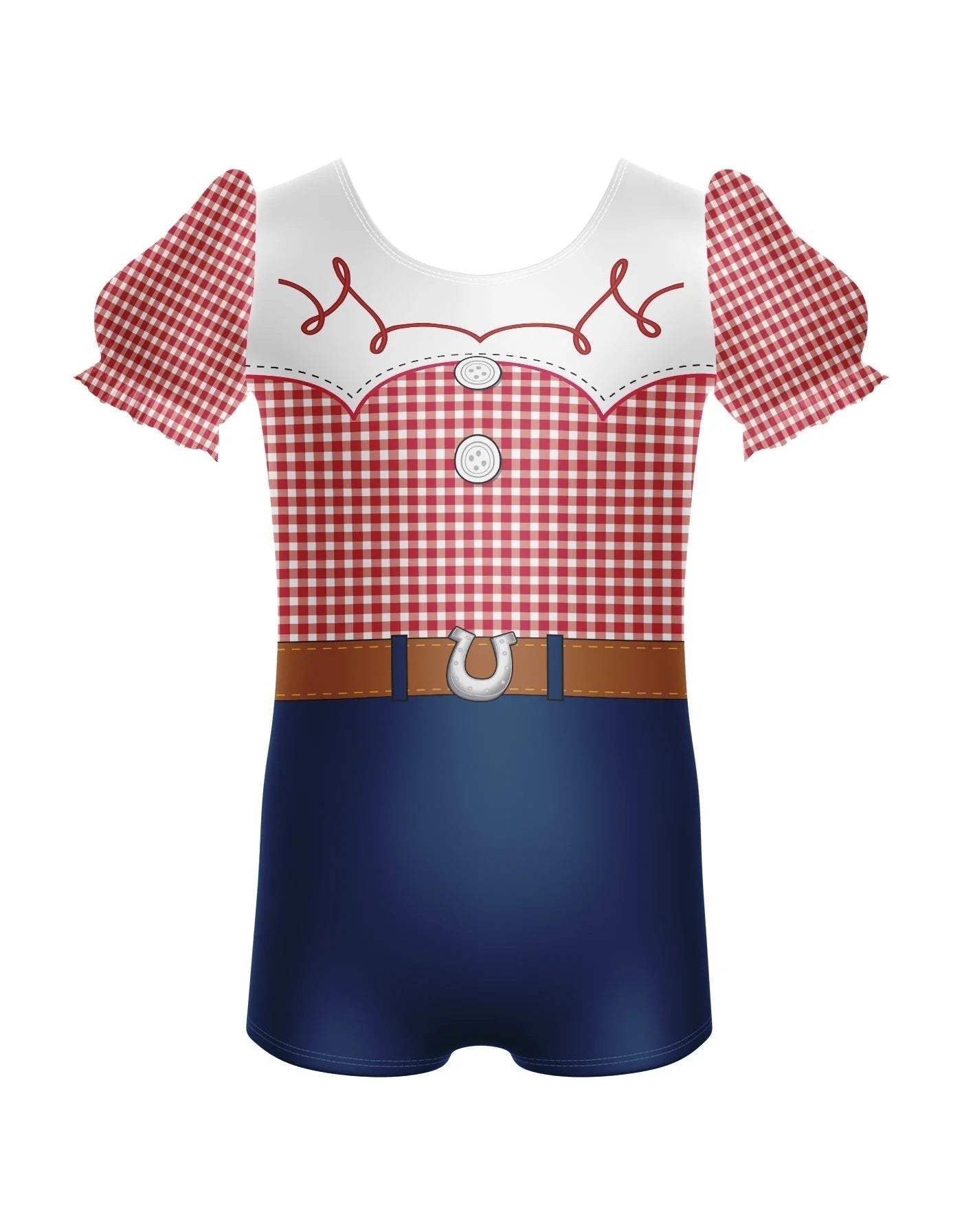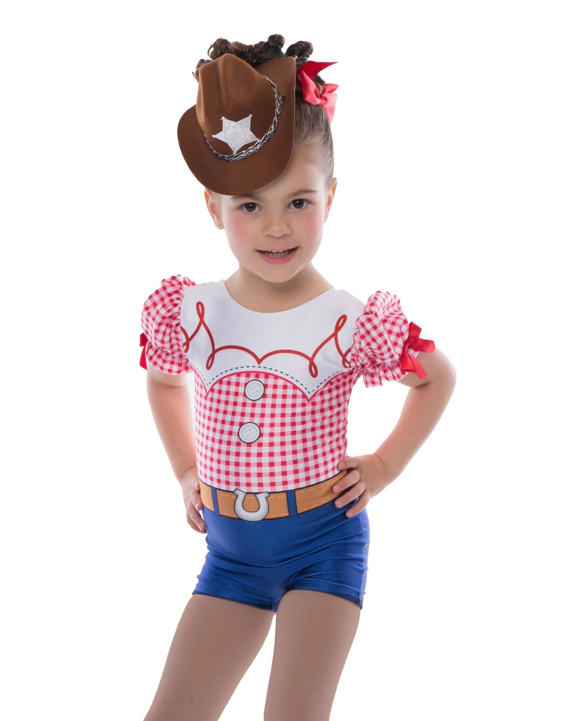 Yeehaw! The Yippie I Yay Costume brings western flair to the stage with its charming puff-sleeve red gingham biketard and playful cowgirl pettibustle with top skirt. Featuring sweet bow accents, a printed belt design, and layered ruffles, this look is perfect for high-energy routines and adorable performances.