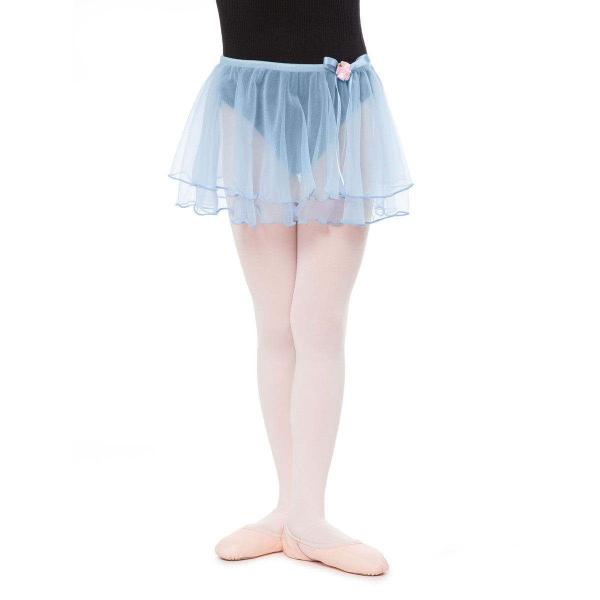 Dainty and delicate, yet durable, this ballet skirt features a sheer double layer made of nylon with finished edges and a satin rosette and bow at the elastic waistband.