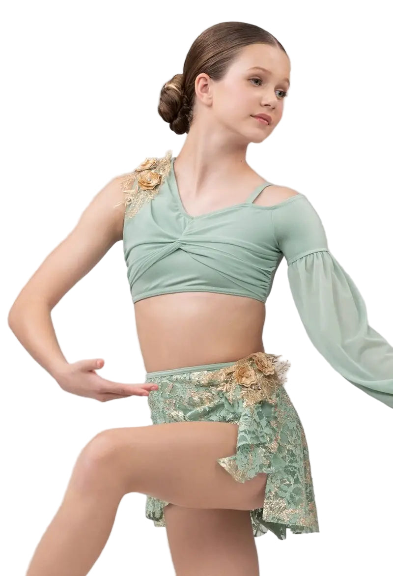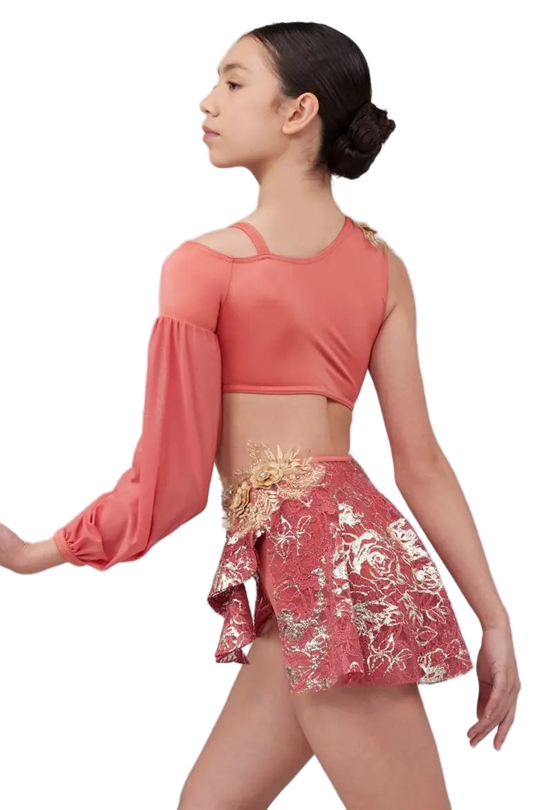 - Cascade skirt of gold foiled lace over built-in spandex briefs