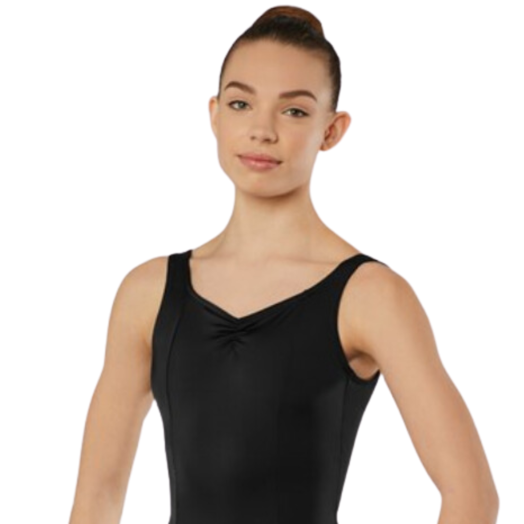 This nylon/spandex leotard features a tank-style design with a pinch-front and a flattering V-neckline. The front princess seams add a touch of elegance, while the low V-back provides a stylish finish. All sizes are fully lined for maximum comfort. Imported fabric of Nylon/Spandex.